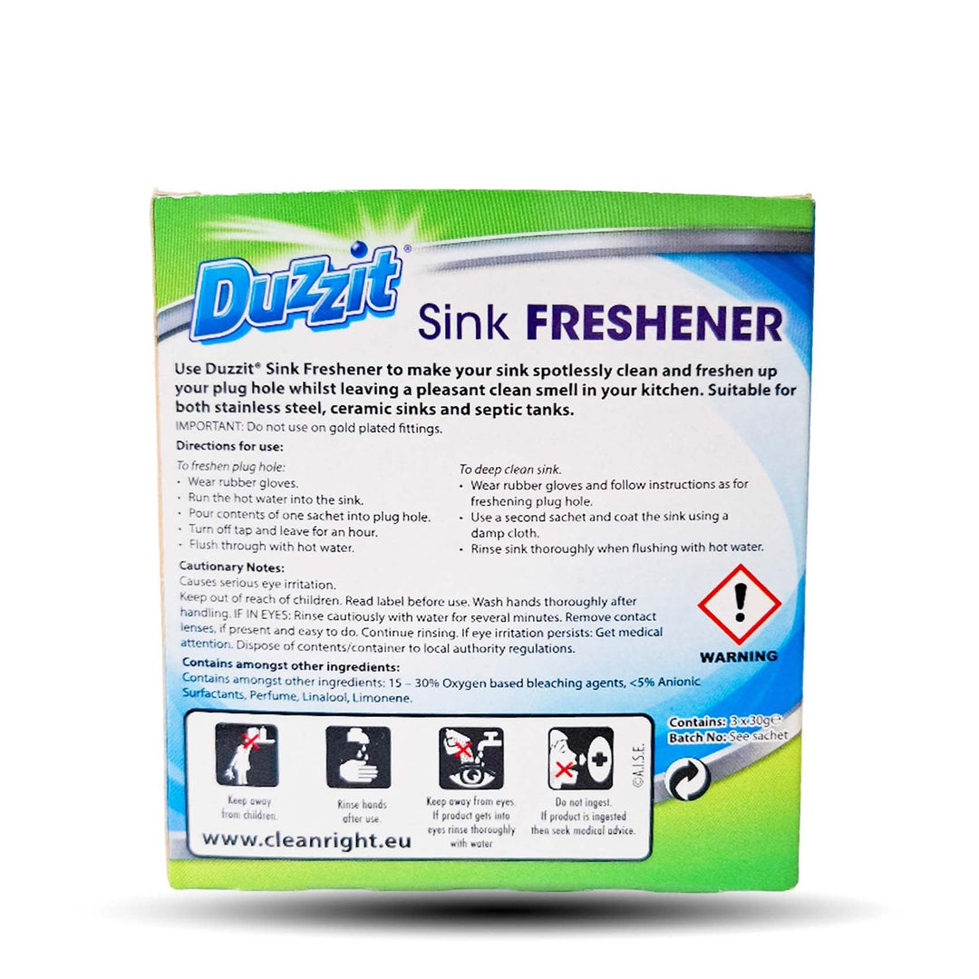 151 DUZZIT 3PK SINK FRESHNER. Freshener discs for sinks designed to neutralize odours and provide a fresh scent. Place one disc in the plughole and replace as needed. Store in a Cool Dry Place. Keep Out of Reach of Children and Pets.