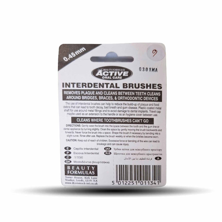 ACTIVE INTERDENTAL BRUSHES ORANGE 6PK (0.45MM). Ergonomic interdental brush to clean between teeth and maintain gum health. Ideal for tight spaces. Use with care.