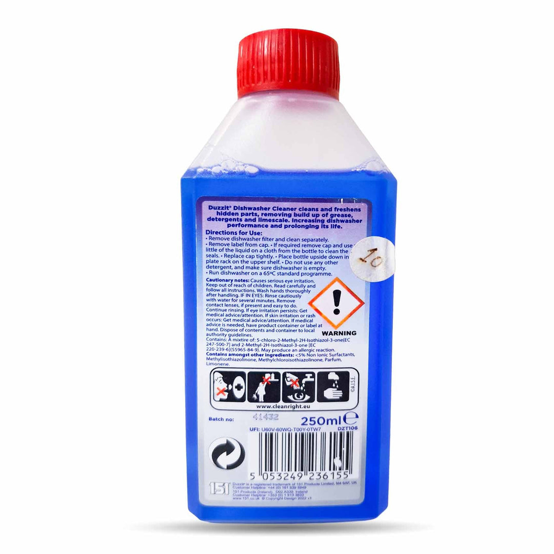 151 DUZZIT DISHWASHER CLEANER 250ML. Effective dishwasher cleaner that removes grease, food deposits, and limescale. Run with an empty machine. Store in a Cool Dry Place. Keep Out of Reach of Children and Pets.