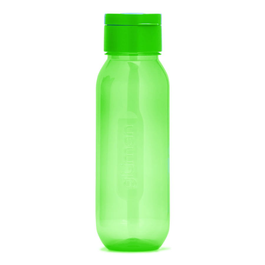 Color: Transparent bottle with a vibrant green spout cap