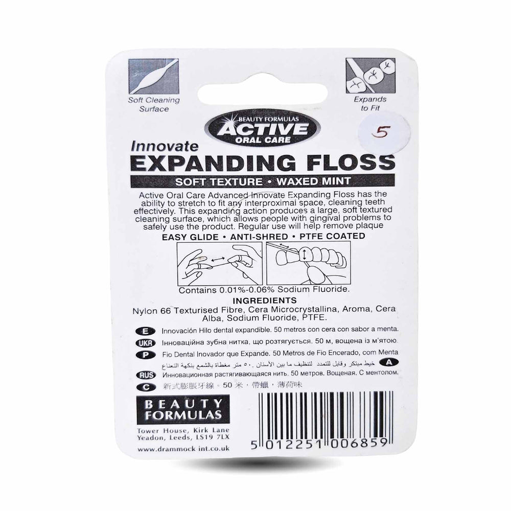 ACTIVE EXPAND. FLOSS INNOVATE 50M. High-quality dental floss designed to remove plaque and food particles from between teeth and below the gumline. Use daily. Store in a Cool Dry Place.