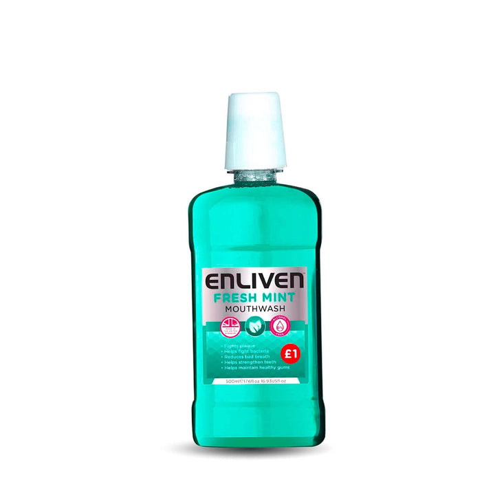 ENLIVEN MOUTHWASH FRESH MINT 500ML. Refreshing mouthwash for long-lasting fresh breath. Use twice daily. Store in a Cool Dry Place.